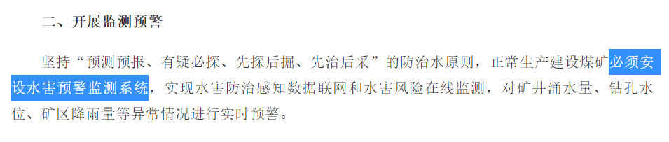 坚持“预测预报、有疑必探、先探后掘、先治后采”的防治水原则,正常生产建设煤矿必须安设水害预警监测系统,实现水害防治感知数据联网和水害风险在线监测,对矿井涌水量、钻孔水位、矿区降雨量等异常情况进行实时预警。